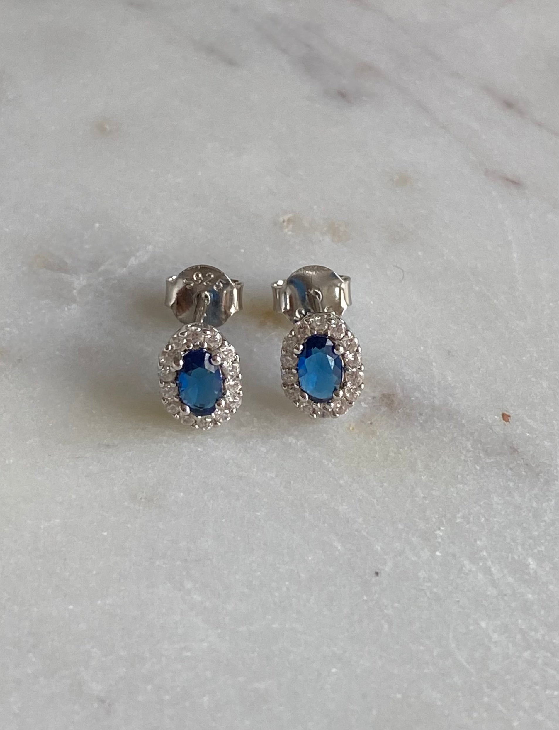 Aretes de plata 925 con zirconia azul y halo de zirconia.